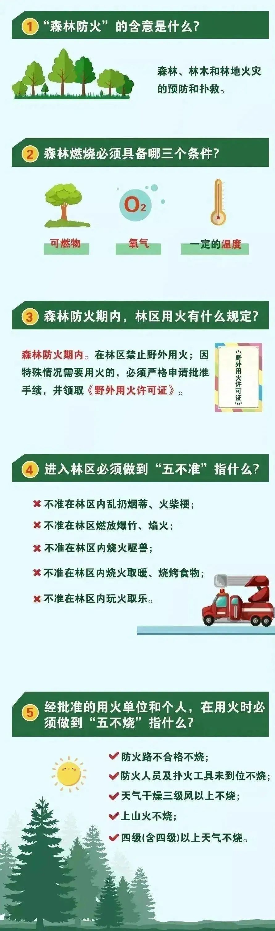 一、牢记森林防火期。我区每年的11月1日至次年的5月31日为森林防火期。全区以往发生的森林火灾,绝大多数都是人为造成的。因此,广大师生要从自我做起,从点滴做起,谨防森林火灾。在森林防火期内,请相互督促,不野外用火玩火,不乱放烟花爆竹。