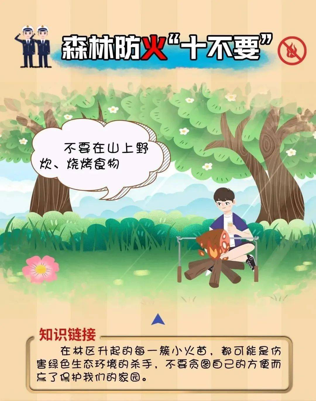 二、进山切勿带火种。进山游玩时主动接受护林人员的防火检查,主动向林区检查站交出随身携带的火种,不在森林及距森林边缘500米范围内从事烧荒、燃放烟花爆竹、吸烟、野炊、投放孔明灯及其他易引发森林火灾的用火行为。