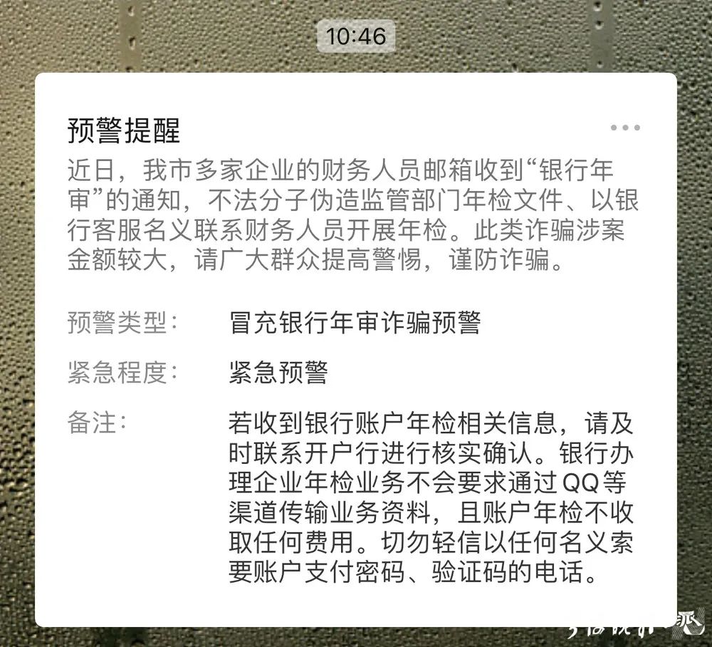 反诈提醒:若收到银行账户年检相关信息,请及时联系开户行进行核实确认。银行办理企业年检业务不会要求通过QQ等渠道传输业务资料,且账户年检不收取任何费用。建议企业提高防范意识,加强内部人员沟通,切勿轻信以任何名义索要账户支付密码、验证码的电话,一旦发现疑似诈骗或被骗,请及时拨打110或96110,准确提供转账时间、金额、对方账户等信息,配合警方做好止损、取证等工作。