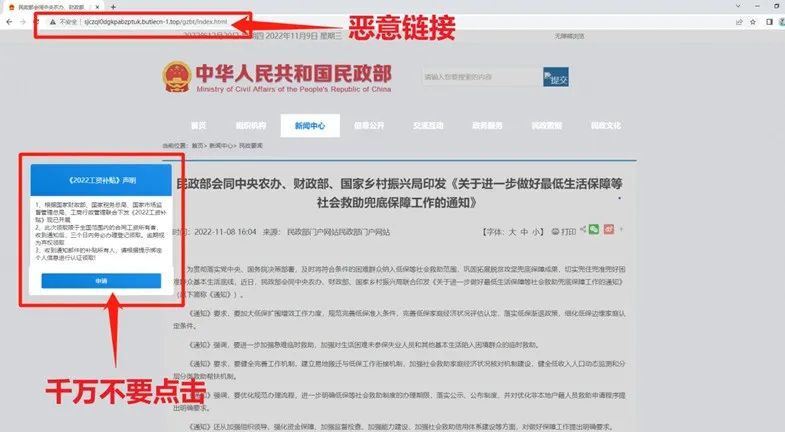 今年1月,民政部在官方微博上也发出提醒,有人假借民政部往期发布的通知,制作仿冒页面,并在假冒界面增加弹窗,诱导群众点击弹窗、输入个人敏感信息进行诈骗活动。