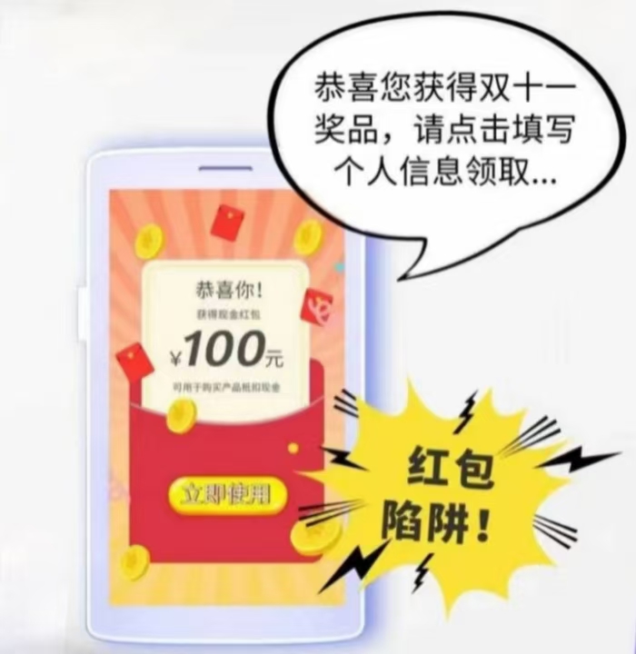 各大电商平台会以派发红包的方式为促销活动预热,有不法分子借机在微信朋友圈、微信群等平台诱骗大家点击,当你点开红包后随即跳转到其他页面,并显示要提供手机号码、银行账号等个人信息才可以领取福利,当你填完信息提交后,却发现福利并没有到账。这是骗子瞄准“双11”各大电商企业大发红包的做法,制作山寨网页,借此收集大量个人信息,进而实施诈骗。