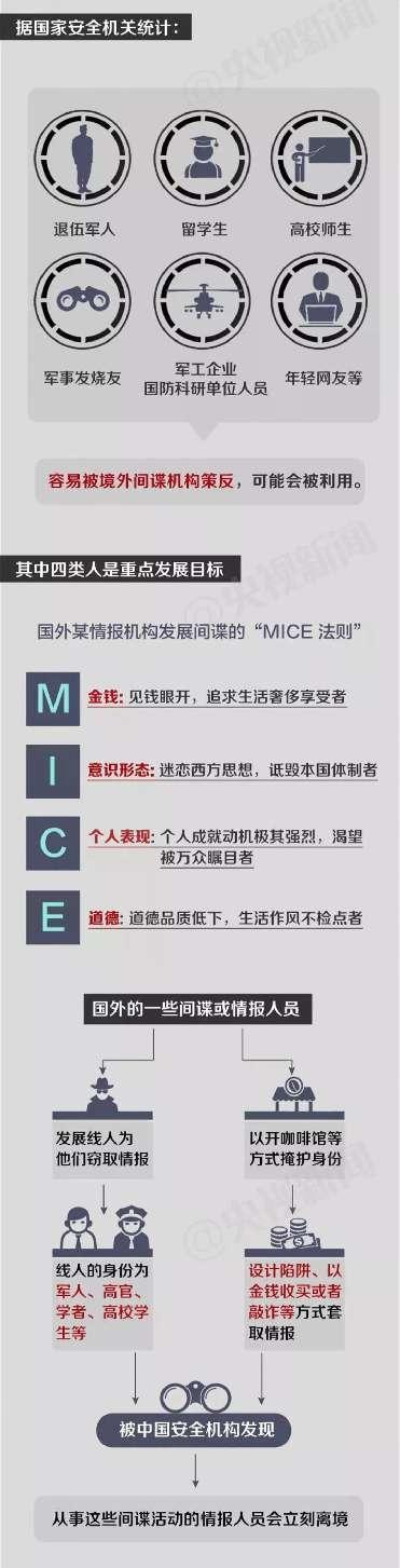另外,境外间谍有可能介入大学生的求职过程,支持鼓励其报考涉密单位,企图将学生发展成为安插在我党政军的潜伏间谍。