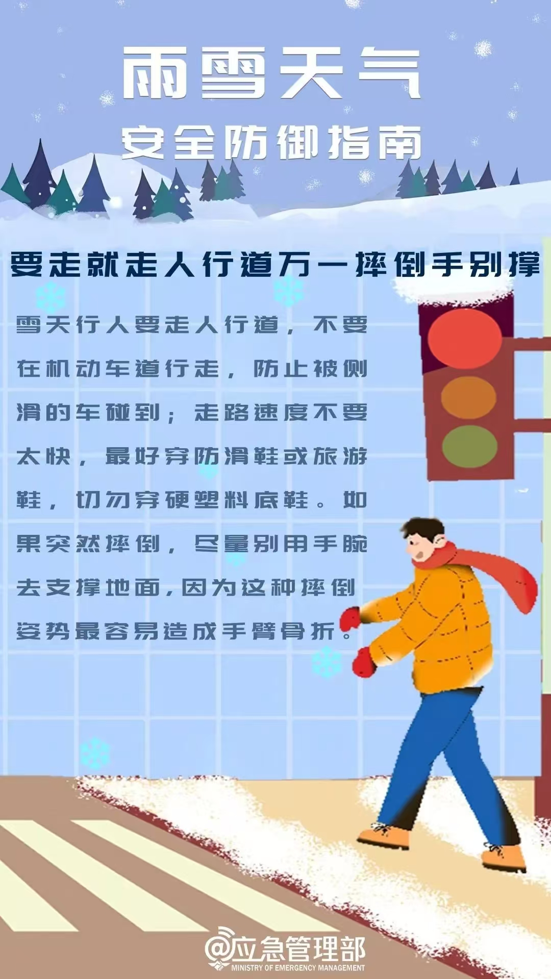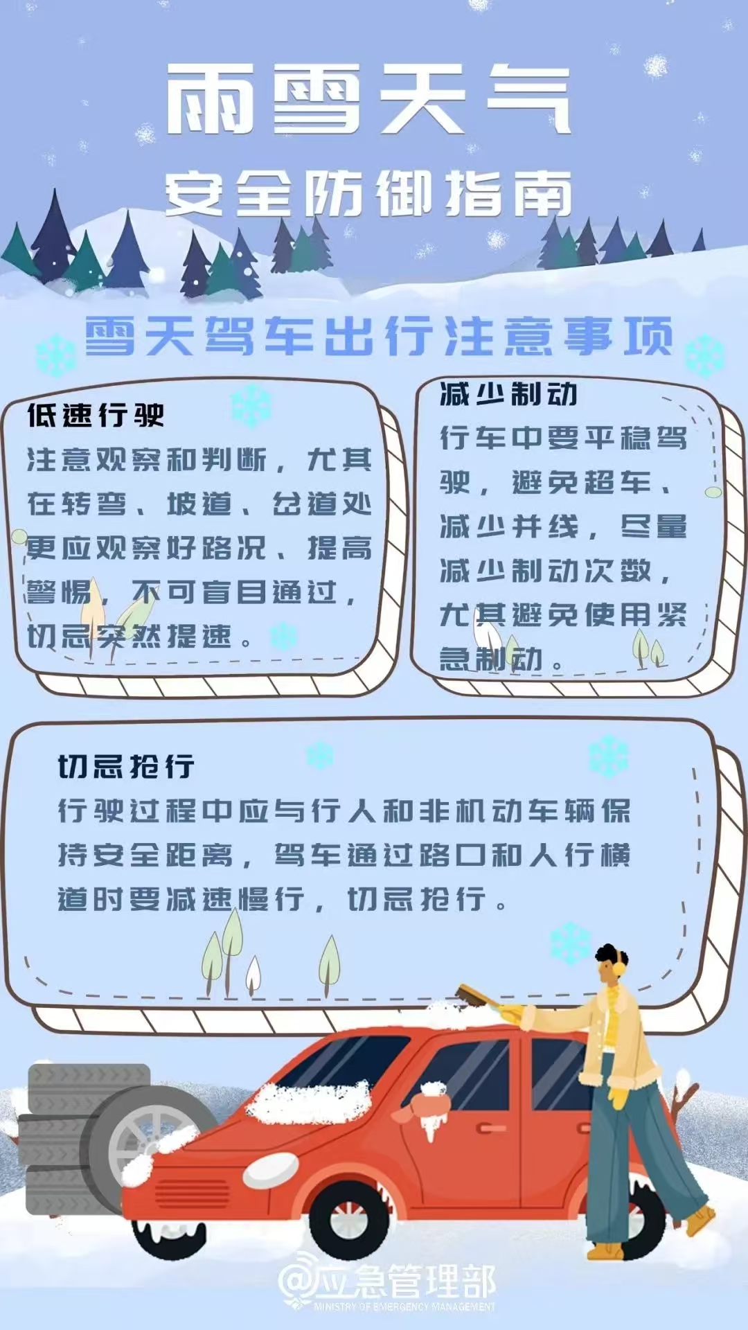 防交通事故。与路面行驶的车辆保持距离,谨防车辆打滑被撞。雨雪天气尽量乘坐公共交通工具,如个人驾车时以平缓为主,遇到车辆侧滑时,正确的操作方式是操控方向盘有效避免甩尾或原地掉头;如遇到事故或故障,在来车方向50米以外设置警示牌,并打开双闪警示灯,有条件情况下,迅速将车挪到路边,不影响其他车辆通行。