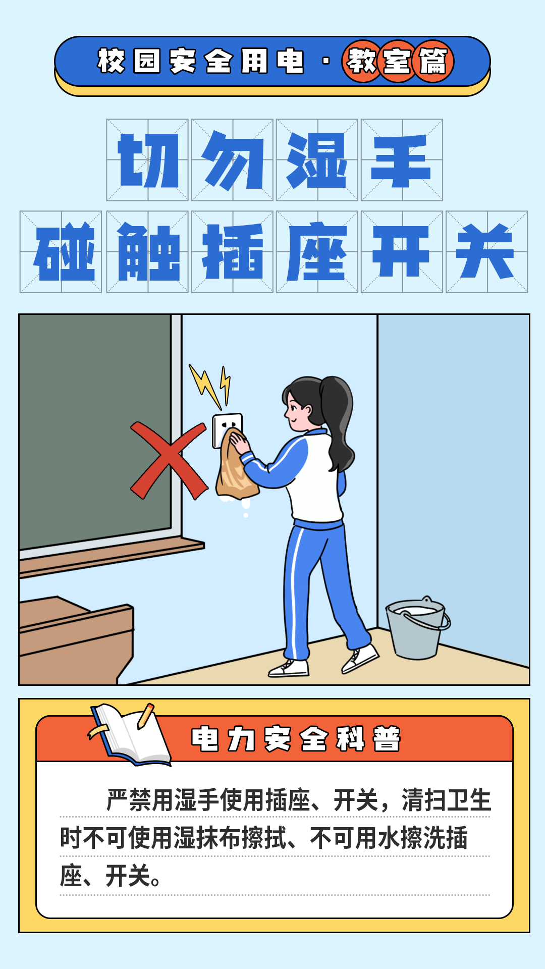 湿手或湿抹布极易导电,因此在接触电源或电器前,务必确保双手干燥。同时,切勿用湿布擦拭带电的插座、开关等电器设备。